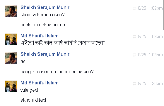 ‘শরীফ ভাই কেমন আছেন? অনেক দিন দেখা হয় না।’ মুনির ভাইয়ের সঙ্গে সব সময় ফেসবুকের ক্ষুদে বার্তায় কথোপকথন শুরু হতো এভাবেই। এই মানুষটা যতদিনই ফেসবুকে কথা বলতেন কোনদিন আমার নামের বানান ভুল করেন নাই। অনেকেই আমার নামের বানান ইংরেজিতে লেখার সময় লিখতেন, ‘Sorif’ অথবা ‘Sarif’। কিন্তু তিনি যতবার আমার নাম লিখেছেন ততবারই সঠিক বানানে লিখেছেন।