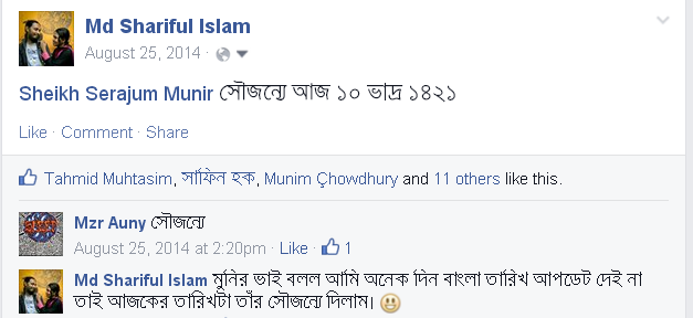 আমার অনেক কাজের মধ্যে ফেসবুকে বাংলায় তারিখ দেয়াটা তাঁর খুব পছন্দের ছিল। আমি বেশ কয়েকদিন বাংলায় তারিখ না দেয়ায় ম্যাসেজ করে বলেছিলেন, ‘ভাই বাংলা মাসের রিমাইন্ডার দেন না কেন?’